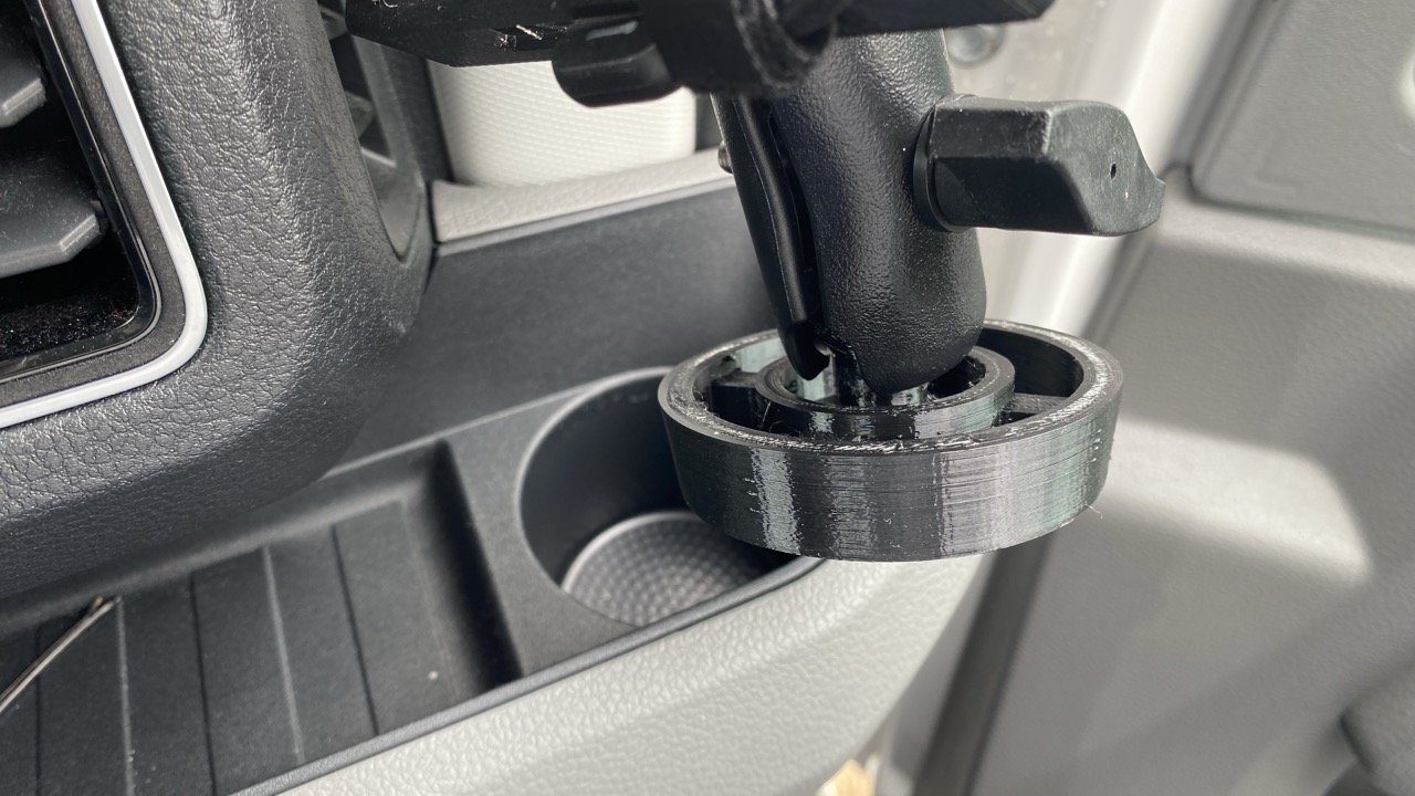 Dieser konische "Topf" wird im Getränkehalter eingelegt und hat einen 1" (25mm) Kugelkopf der einen Standard Schwenkarm aufnehmen kann. Der zusätzliche Handyhalter passt momentan für ein iPhone 8 plus inkl. Hülle und für ein ipHone 11Pro mit Hülle. Das kann man natürlich beliebig, für jedes Handy Modell, in der Breite und Tiefe anpassen.