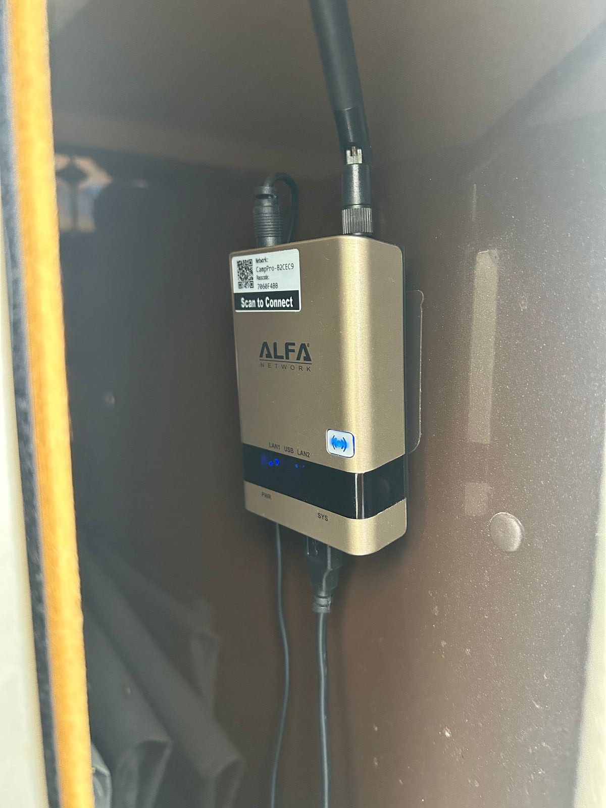 Die Antenne habe ich an Saugnäpfen befestigt und das Kabel durchs Fensterins Womo. 12 Volt Anschluss gelegt und fertig.