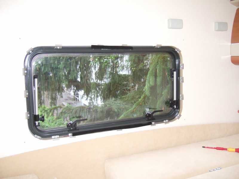 Die Krönung der gewissenhaften Montage im Hobbywerk war, dass beim kleine Fenster im Alkoven auf der Beifahrerseite die Schutzstreifen bei den Klettstreifen noch nicht mal abgezogen und somit auch nicht an der Wand festgeklebt waren. :angry: