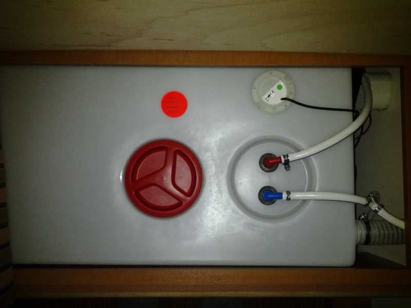 Vom Frischwassertank führen als Saugleitung 1x rot (Warmwasser-) und 1 x blau (Kaltwasserkreis) weg.