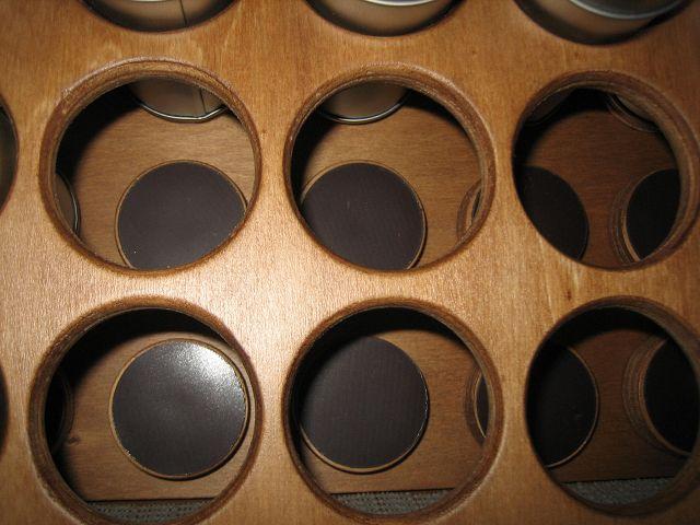 Nach längerer Planungsphase habe ich dann das Regal besser gesagt Steckregal aus Pappel Sperrholz gefertigt, die Öffnungen mit einen Kreisbohrer hergestellt und die Kreisausschnitte an der Rückwand welche ich Parallel zur vorderen Seite schräg ausgeführt habe geschraubt so das die einzelnen Dosen nicht verrutschen können, zusätzlich habe ich noch eine Selbstklebende Magnetfolie auf diese Scheiben geklebt, sicher ist sicher die einzelnen Dosen halten jetzt noch besser, das ganze habe ich noch gebeizt und lackiert, das Ergebnis ist unten in den Bildern zu sehen.