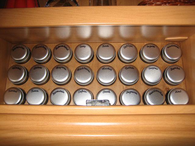 Ja es sind Gewürze und Kräuter welche in ausreichender Auswahl und dafür vorgesehen Aufbewahrungsdosen noch nicht vorhanden waren. Es waren schon Gewürze und Kräuter vorhanden aber nicht übersichtlich an einen Ort da zu wenig Platz und Gefäße vorhanden waren, diesen Zustand wollte ich ändern was aber für das erste nicht so einfach durchführbar war. Da war erstens die Auswahl der Gefäße, sie sollten ja leicht sein und da schied Glas obwohl es da eine größere Auswahl davon gab von Anfang an einmal aus, es kamen nur leichte aus Weißblech und nicht allzu große Dosen in Frage um möglichst viele unterzubringen, nach einigen suchen im Internet bin ich doch noch fündig geworden, so jetzt war dann noch der richtige Platz im WoMo festzulegen wo ich diese Dosen welche ja alle zusammen und nicht wieder getrennt von einander ihren Platz finden sollten und leicht erreichbar vom Herd sein sollten. Diese Aufgabenstellung war nicht so einfach weil ich die Dosen nicht irgendwie im Küchenbereich sichtbar hinstellen wollte, oder ein Regal irgendwo montieren nein das wollte ich nicht, nach einigen Überlegungen und umschlichten der einzelnen Oberschränke habe ich doch noch eine Lösung gefunden welche für mich die beste war, und ich mußte nur noch Maria den Vorschlag unterbreiten, und davon überzeugen das dies die beste Lösung sein würde, wie so oft waren wir uns einig das der Platz wie dafür geschaffen war.