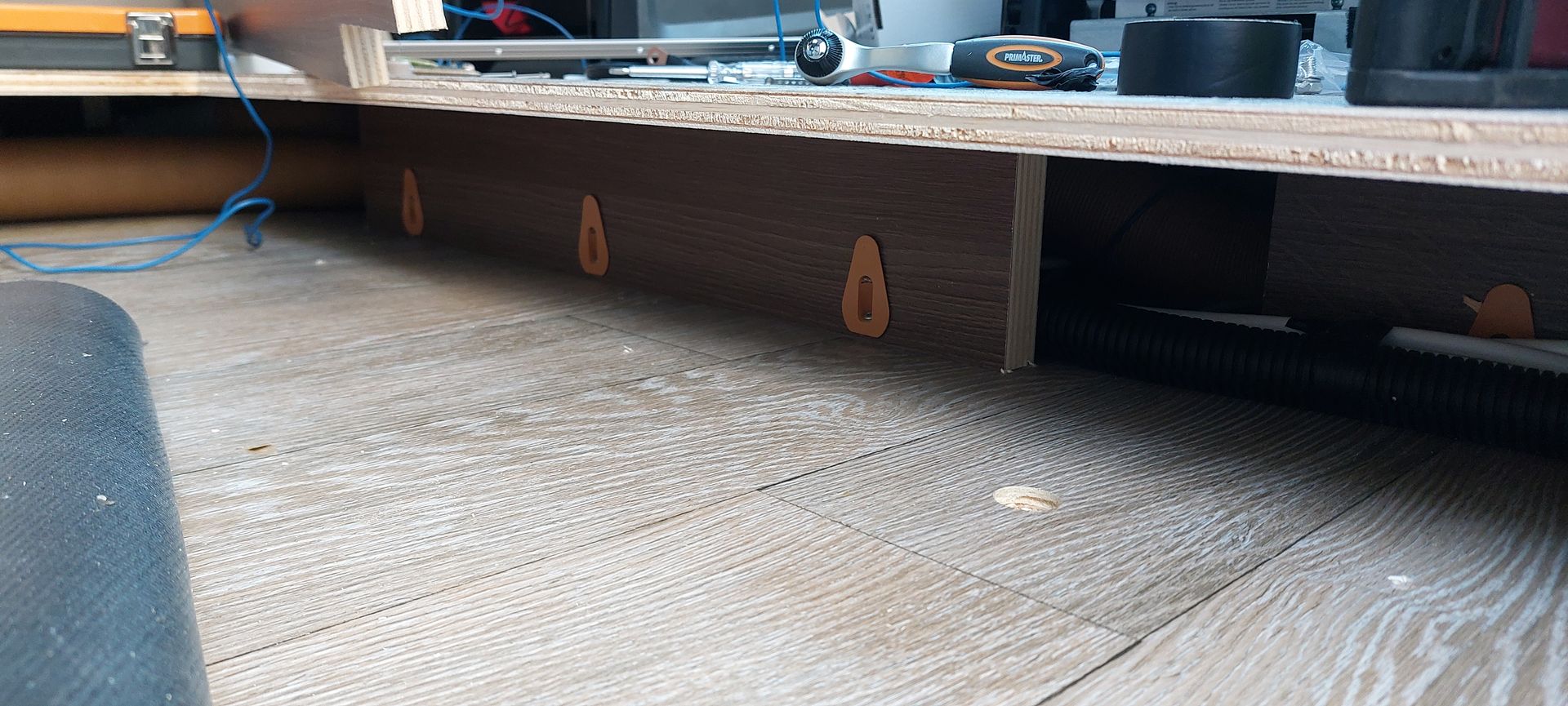 Das Kabel hierfür ebenfalls unter dem Podest durch und hinter der seitlichen Blende hochgezogen.